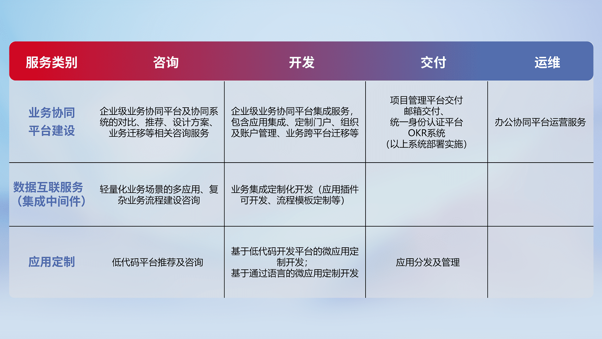 针对钉钉、、企微、、IDaas等平台级产品提供产品的规划、、、方案、、、交付、、定制化开发等服务,,,,实现如统一协同办公、、、、智能客户服务、、、混合会议管理、、智能数据查询、、、等业务场景,,,实现数字化转型。。